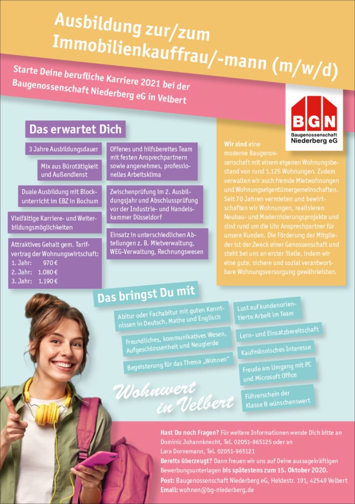 Premium anzeige ausbildung zum immobilienkauffrau/-kaufmann (m/w/d) wohnungsgenossenschaft neukölln eg berlin wir sind eine über 115jährige wohnungsgenossenschaft in berlin-neukölln mit ca. 4. 000 wohnungen in berlin. wir stellen unseren mitgliedern bezahlbaren und sicheren wohnraum zur verfügung. Hier findest du freie ausbildungsplätze als immobilienkaufmann. um deine nutzererfahrung und sicherheit auf unserer website zu verbessern, nutzen wir cookie-technologien, um personenbezogene daten zu sammeln und zu verarbeiten. Deine ausbildung ist dual das heißt, sie erfolgt im wechsel in der berufsschule und deiner ausbildungssparkasse. so kannst du die erlernte theorie, die seit 2020 noch digitaler, transparenter sowie kundenund praxisorientierter angelegt ist direkt in deinem berufsalltag bei der sparkasse anwenden und vertiefen.